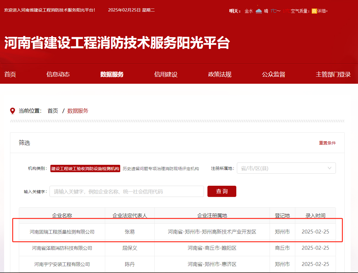 熱烈祝賀河南固瑞工程質量檢測有限公司入冊河南省建設工程消防技術服務陽光平臺?。。?